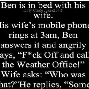 Ben is in bed with his wife. His wife’s mobile phone rings at 3 am, Ben answers it and angrily says, “F*ck Off and call the Weather…