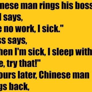 Chinese man rings his boss and says, “Me no work, I sick.” Boss says, “When I’m sick, I sleep with my wife, try that!” 2 hours later,…