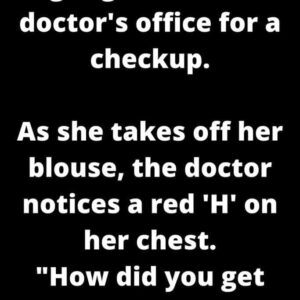 A girl goes into the doctor’s office for a checkup, and as she takes off her blouse, he notices a red “H” on her chest. “How did…