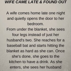 A wife comes home late one night and quietly opens the door to her bedroom. From under the blanket, she sees four legs instead of just her…