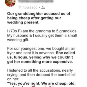 My husband and I bought our granddaughter a wedding gift from her registry. She reached out and accused us of being cheap after getting the wedding present….