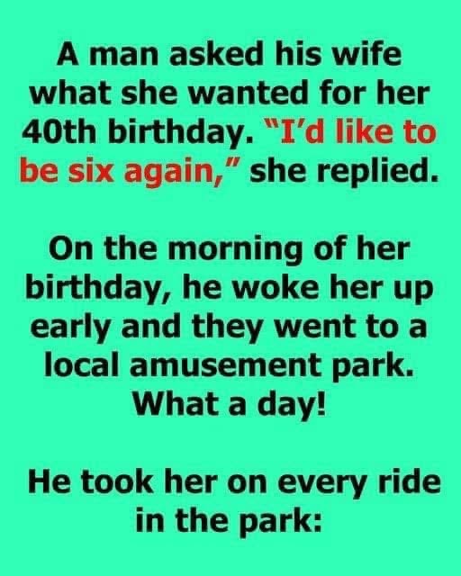 A man asked his wife what she wanted for her 40th birthday. “I’d like to be six again,” she replied. On the morning of her birthday, he woke her up early and they went to a local amusement park. What a day! He took her on every ride in the park: