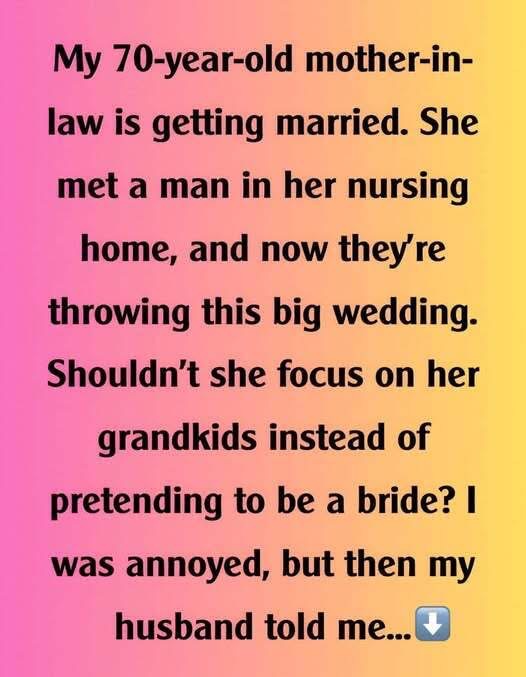 My 70-year-old mother-in-law is getting married. She met a man in her nursing home, and now they’re throwing this big wedding. I mean, at her age, it seems a bit… much, right? Shouldn’t she be focusing on her grandkids instead of pretending to be a bride? I was annoyed, thinking she was making a fool of herself, but then my husband sat me down. He told me that the man she’s marrying isn’t just a random nursing home fling….