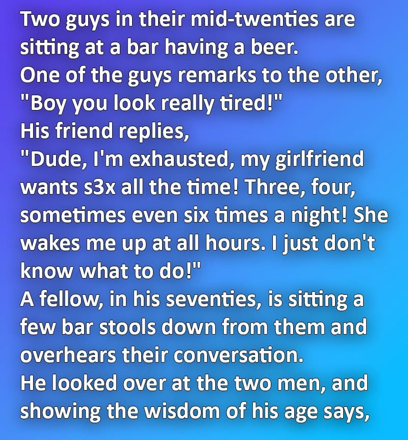 A fellow, in his seventies, is sitting a few bar stools down from them and overhears their conversation. He looked over at the two men, and showing the wisdom of his age says,