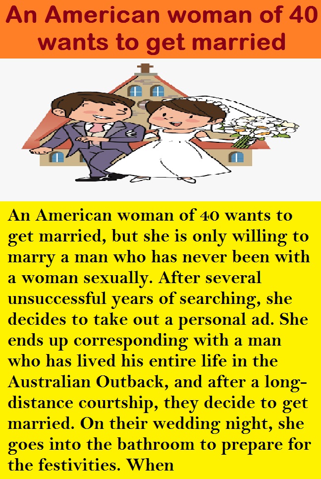 An American woman of 40 wants to get married, but she is only willing to marry a man who has never been with a woman sexually. After several unsuccessful years of searching, she decides to take out a personal ad. She ends up corresponding with a man who has lived his entire life in the Australian Outback,