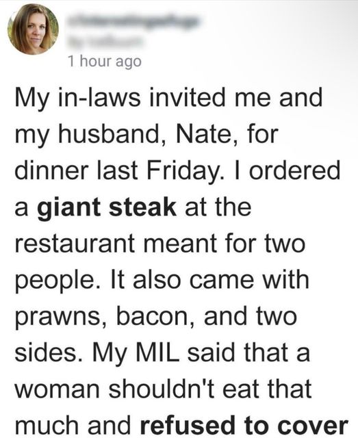 The mother-in-law claimed that a woman her size shouldn’t be eating that much and that her actions made others at the table uncomfortable. She then demanded that her daughter-in-law and son pay for the entire bill because she did not want to spend as much. The woman narrated:
