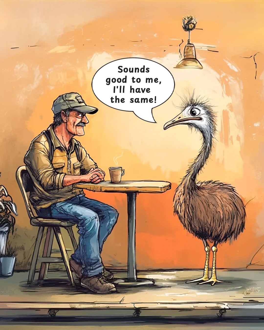 The waitress, ill eyeing the emu, finally curiously asked, “So, what about the bird?”