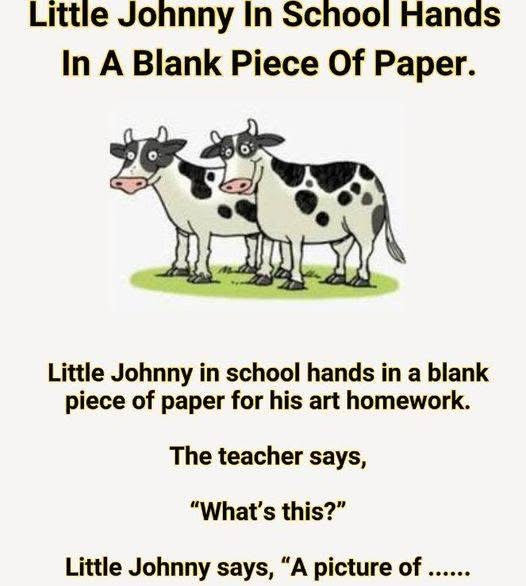 Little Johnny at school submits a blank piece of paper for his art homework. The teacher says: “What’s this?” Little Johnny says, “A picture of a cow eating grass.” The teacher inquires, “Where’s the grass?”