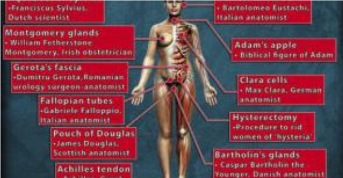 Common names of body parts like the Adam’s apple or the Achilles tendon are named after historical men. The speculum, a gynecological instrument used to perform a pap smear, was named after an American slave trader.