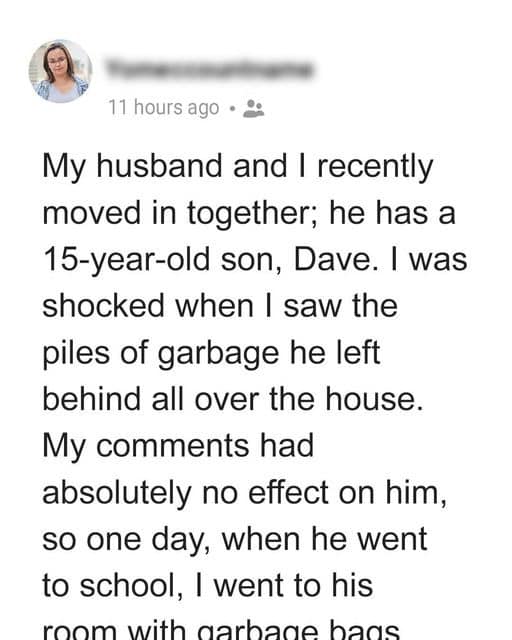 A couple of weeks ago, I finally moved in with my husband, which was supposed to be the beginning of a wonderful chapter in our lives. I had no idea that my husband’s 15-year-old son from a previous marriage, named Dave, would prove to be a difficult obstacle to overcome. Though I knew there would be some period of adaptation, I did not expect such an attitude towards my efforts to make the house our cozy place in the form of piles of garbage that Dave, as if on purpose, left scattered throughout the house.