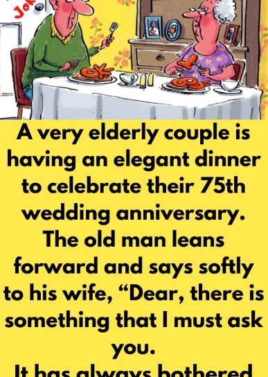 A very elderly couple is having an elegant dinner to celebrate their 75th wedding anniversary. The old man leans forward and says softly to his wife, “Dear, there is something that I must ask you.