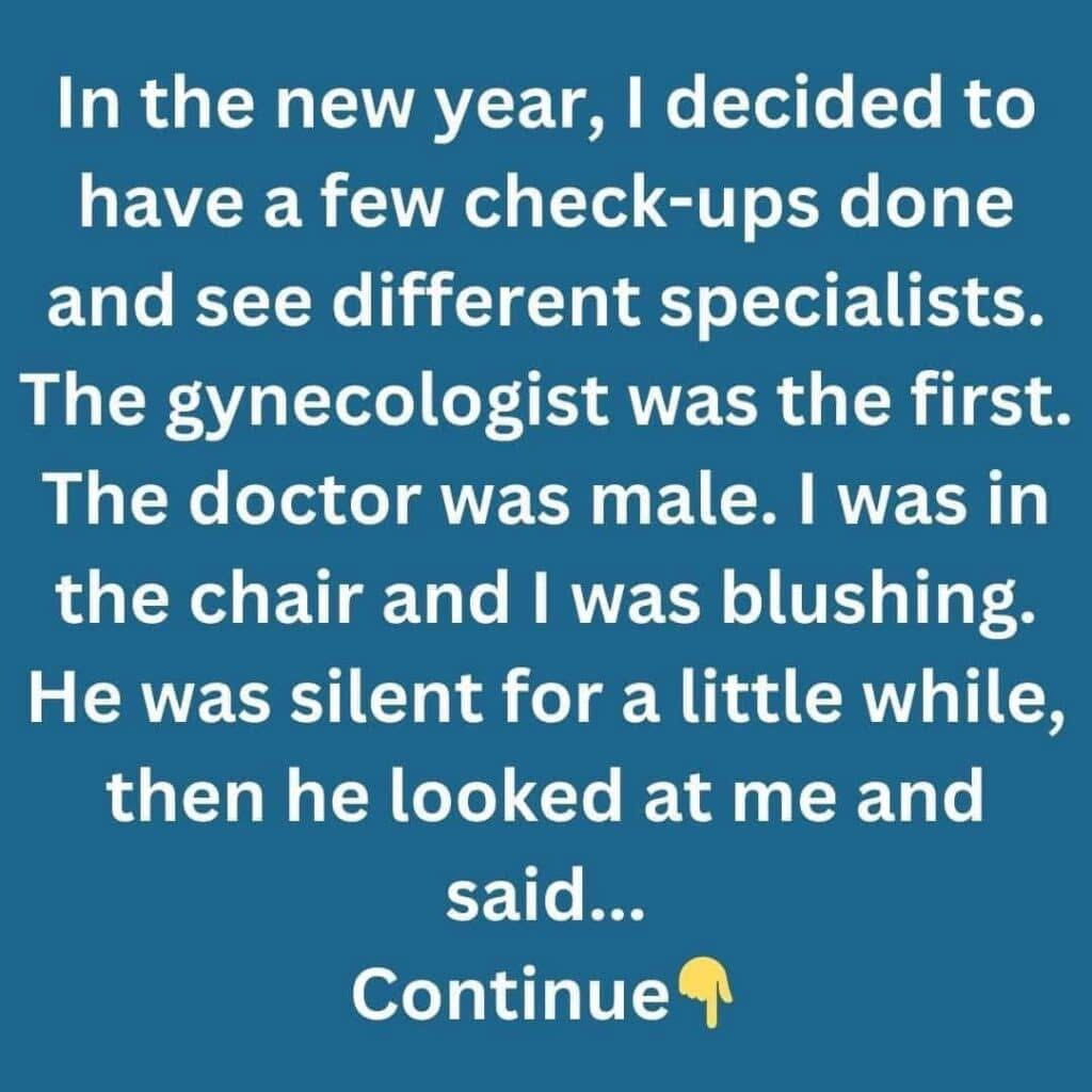 The gynecologist was the first.The doctor was male. I was in the chair and I was blushing.
