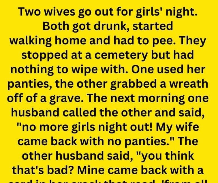They sat in silence for a moment before the first husband chuckled. “At least your wife made it back with some dignity. Mine stumbled in, flopped onto the bed, and mumbled, ‘It’s okay, I made a donation to the spirits.’ I didn’t know what she meant until I found her panties in the front yard.”
