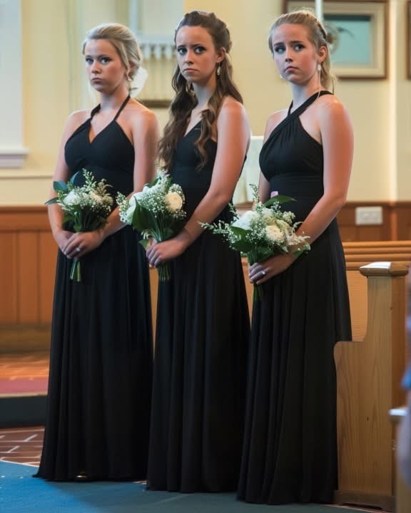 Sofia’s entrance, which had been eagerly anticipated as the culmination of months of planning, quickly turned into a moment of profound confusion and distress. As she walked down the aisle in her stunning white gown—a vision of bridal radiance that had been the subject of countless discussions and design sessions—she was met not with the warmth of celebration, but with the cold, stark reality of the black-clad bridesmaids.