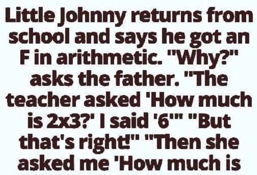 Most people didn’t enjoy math in school—numbers, fractions, and percentages aren’t exactly easy. Little Johnny was no exception, and his poor multiplication skills got him into trouble.He came home and told his dad, “I got an F in math today.”His dad asked, “What happened?”Johnny explained, “The teacher asked, ‘What’s 3 times 2?’ I said 6.”His dad replied, “That’s correct.”Johnny continued, “Then she asked, ‘What’s 2 times 3?’”His dad shouted, “What’s the difference?”Johnny grinned,
