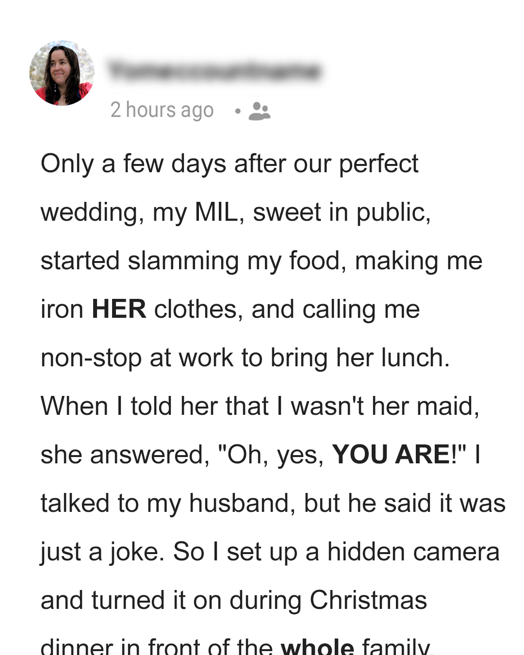 Two days later, we hosted a dinner for my in-laws, and I took charge of cooking and serving everything. As they arrived, they presented us with a bottle of wine and a set of cooking utensils.Nice, I thought. Little did I know that this was just the beginning. While Sam engaged his dad in a work-related discussion, I took the chicken from the oven. That’s when my mother-in-law, Janine, dropped a bombshell, asking, “Do you wanna serve this for our lunch? It looks really bad and smells the same. “I was stunned, unsure how to react. At that moment, my father-in-law joined us, and she immediately switched to a sweet tone, praising my cooking. The sudden change left me perplexed. Confused by her behavior, I wondered if something was wrong. Was there an underlying problem? The next day, she invited me to their home. I anticipated an apology, but she requested help with ironing and organizing clothes due to supposed back pain.I agreed, but after working for hours, I observed her playing with their dog, showing no signs of discomfort. It started to bother me more and more. The situation escalated when she called me at work, insisting I bring her lunch. Occupied in a meeting, I refused, but her persistent calls continued.After the meeting, I reluctantly took her lunch, only to face her anger. She accused me of being late, shouting, “I called you three hours ago. I’m starving!” Frustrated, I retorted, asking about Ursula, their maid. To my shock, she widened her eyes and said, “Honey, I fired her. Why do I need to pay someone money if I have you?” “But I’m not your maid, Janine.” “Oh, yes, you are my girl! Didn’t you know about that?” “About what?” “That you have to listen to me unquestioningly?” she said. “Who said this?” I asked, looking at her incredulously. “I’m saying so. Now. If you wanna be with my son, of course.”Although I was furious, I didn’t reveal my emotions and went home to stop this nonsense with Sam’s help. However, he dismissed it as a joke, believing his mom couldn’t be so unreasonable.Determined to reveal the truth, I set up a hidden camera in the kitchen on Christmas Eve, hoping to capture any unusual behavior from my mother-in-law. As I observed, Janine’s behavior took a shocking turn when she started attacking me verbally, criticizing every move, and questioning my abilities in the kitchen. Her words were sharp, filled with disdain, and I stood there, absorbing the unwarranted assault.In that intense moment, as Janine’s tirade reached its peak, I seized the opportunity to turn the tables. With a quick flick of a switch, I activated the projector in the dining room where the whole family had gathered. The room was instantly filled with the vivid display of Janine’s unjust behavior captured by the hidden camera. “What’s this? You can’t even cook a nice Christmas dinner. Moreover, you have butterfingers. I’ll be totally ashamed of your meal in front of all my relatives. I just regret that your son chose you. But that’s okay, I’ll make sure he dumps you as soon as possible.” As the shocking footage played out for everyone to see, a collective gasp filled the room, especially Sam and my father-in-law. When unexpecting Janine entered the dining room, all the guests there looked at her with disgust. She couldn’t get why, and then Sam said: “We saw everything that was happening in the kitchen. All your words were heard, Mom.” The projection vividly exposed Janine’s true colors, and the family was forced to confront the reality of her actions. She started yelling that I provoked her and it’s all not true, but Sam took a stand and kicked her out of our home. His father, fed up with her actions, later asked for a divorce. The shocking revelation turned out to be the last straw in their strained relationship.Sam came to me and apologized, regretting that he didn’t believe me.That day, I learned to trust my instincts and stand up against unjust behavior, even if it comes from unexpected quarters.