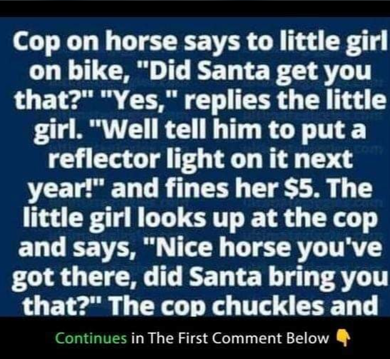 Cop on horse says to little girl on bike, “Did Santa get you that?” “Yes,” replies the little girl. “Well tell him to put a reflector light on it next year!” and fines her $5.