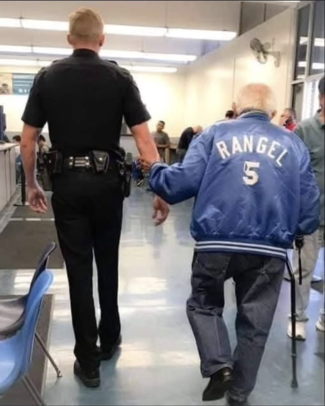 The officer decided to help the elderly man rather than simply kick him out of the bank.