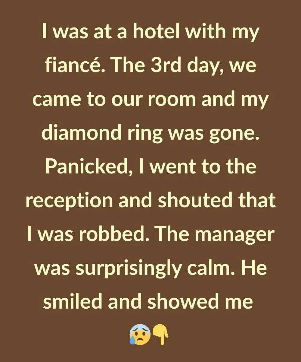 I was at a hotel with my fiancé. On the 3rd day, we came to our room and my diamond ring was gone. Panicked, I went to the reception and shouted that I had been robbed. The manager was surprisingly calm, showing no reaction. He smiled and showed me an unpaid receipt.