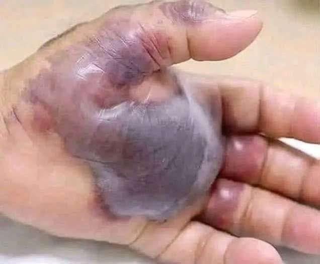 What started as a small sting turned into a horrifying medical emergency. This terrifying image shows a hand severely swollen and blackened—an advanced infection that spread rapidly within hours. Doctors believe it may have been caused by a spider or insect bite, or possibly an aggressive form of necrotizing fasciitis, also known as flesh-eating bacteria.