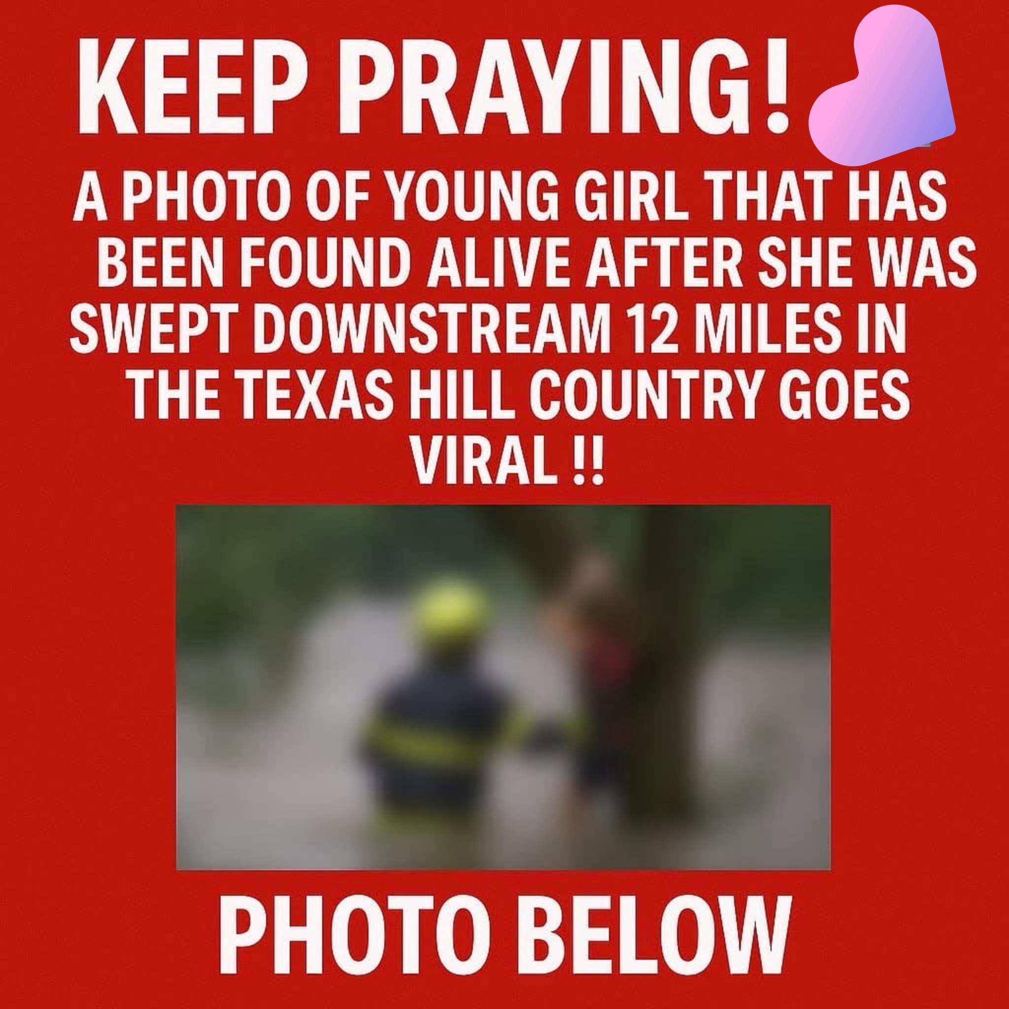 A moment of hope has emerged out of the tragedy in Kerr County: a young girl has been found alive after being swept over 12 miles downstream in Texas Hill Country floodwaters.Her image is now going viral — not because she was rescued, but because many feared she wouldn’t be.