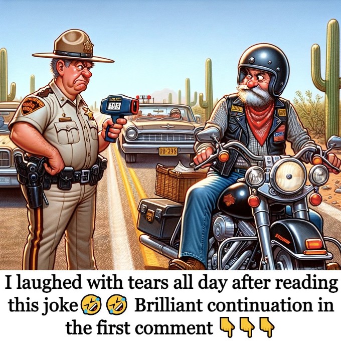 The officer is in a good mood, thinks he might just give the old biker a break and write him out a warning instead of a ticket.