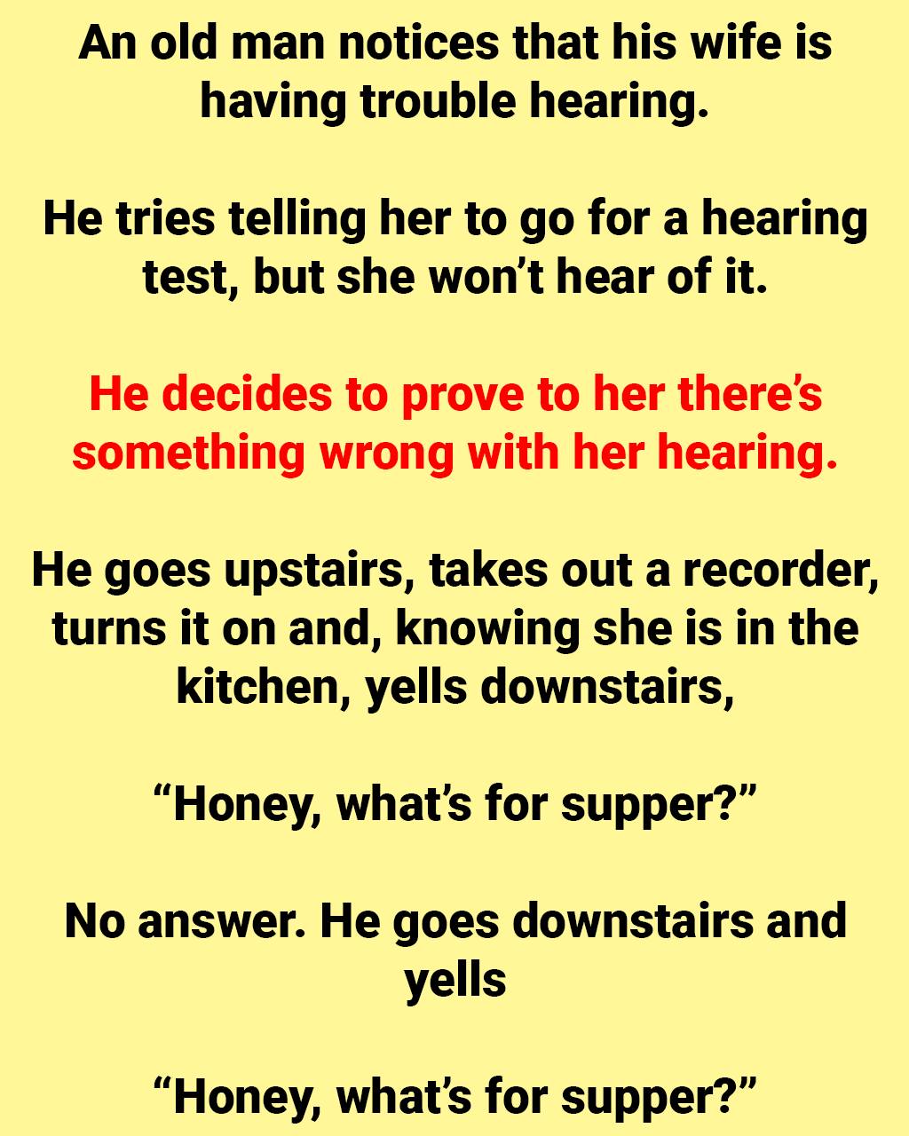 An elderly guy notices that his wife is having difficulty hearing. He attempts to convince her to take a hearing test, but she refuses. He decides to show her that something is amiss with her hearing.