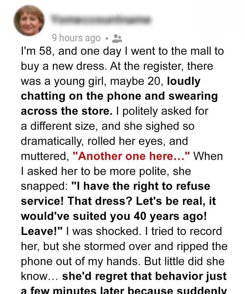 Before I could react, a woman about my age came out from the back—she was the store owner, and as it turned out, the rude clerk’s mother.
