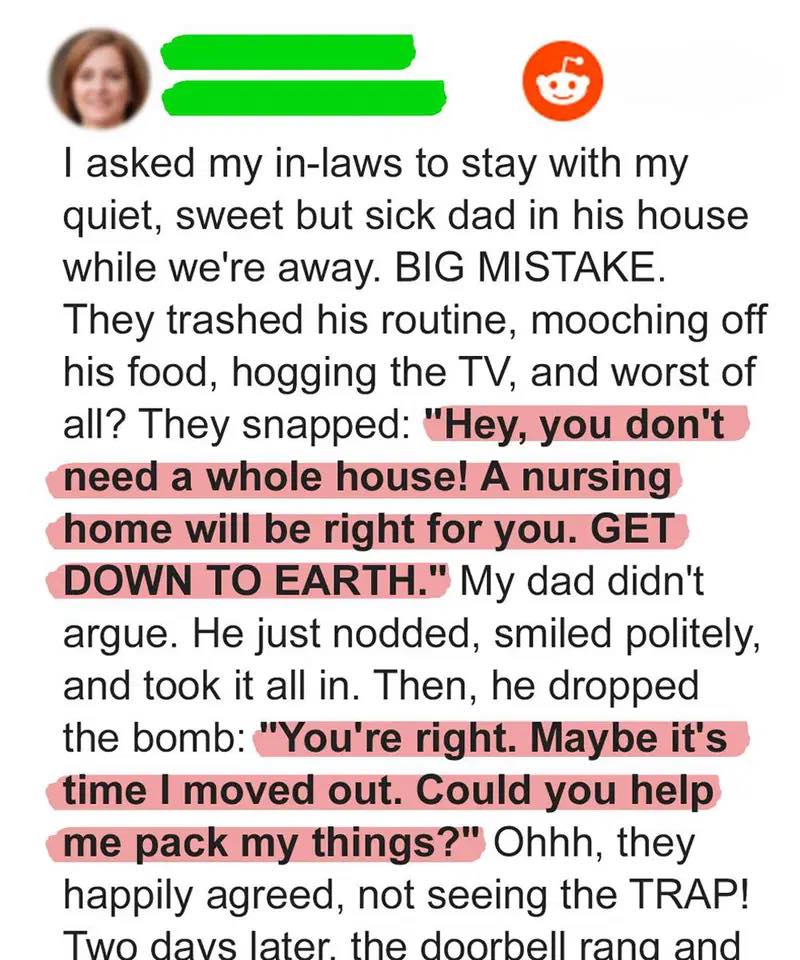 But once they arrived, they acted like the house was their own—complaining about the meals, making fun of the décor, and implying my father should be moved to a care home.
