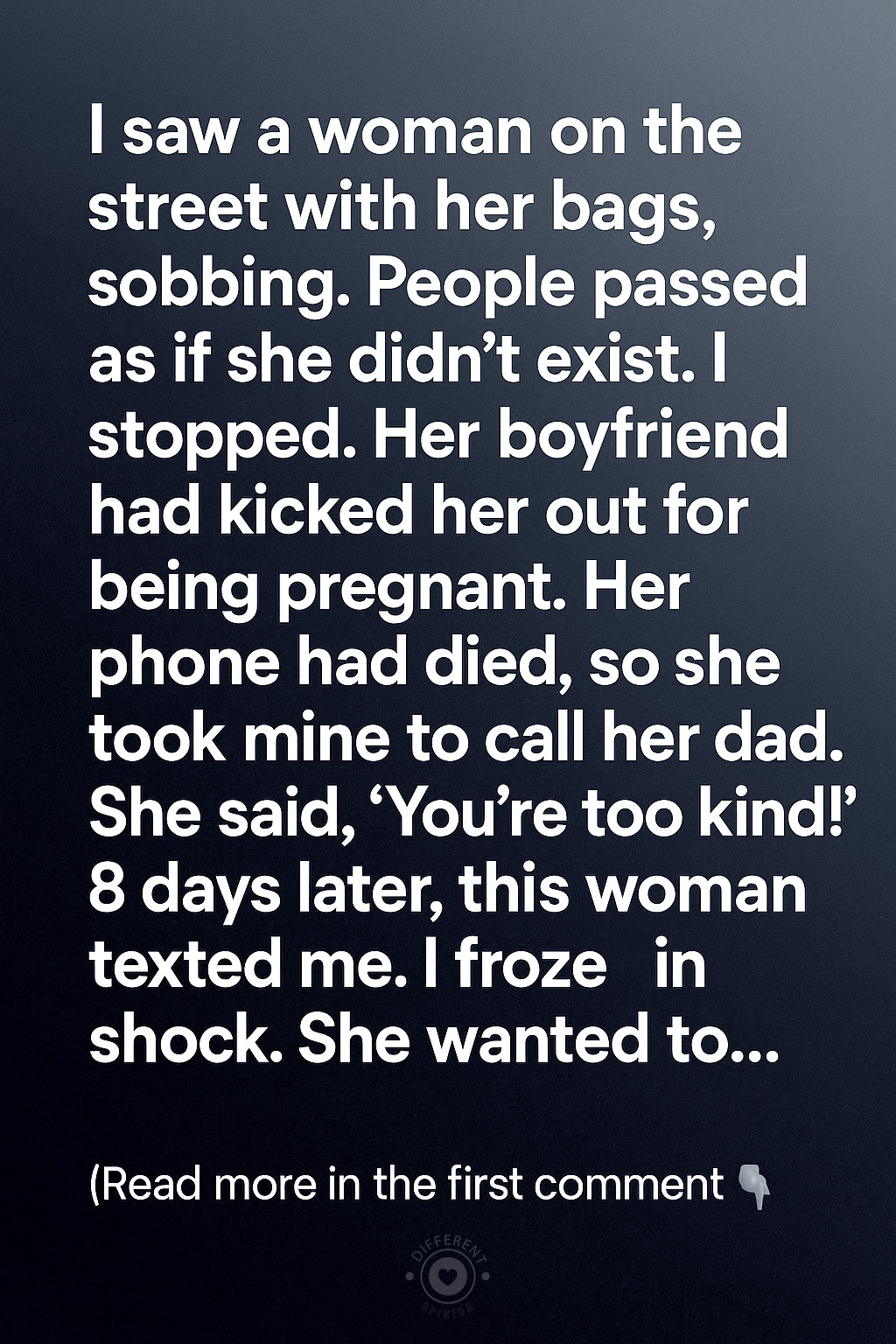 I saw a woman on the street with her bags, sobbing. People passed as if she didn’t exist. I stopped. Her boyfriend had kicked her out for being pregnant. Her phone had died, so she took mine to call her dad. She said, ‘You’re too kind!’ 8 days later, this woman texted me. I froze in shock. She wanted to… thank me again. Her message wasn’t long, but every word carried warmth. She told me that in the moment I stopped for her, she felt seen, safe, and human again. She said her dad came within thirty minutes that day and took her home. She was now staying with her family, resting, and focusing on her baby’s health. I remembered the fear in her eyes when we met, and now her message was filled with hope. It felt like watching a flower lift its head after heavy rain.