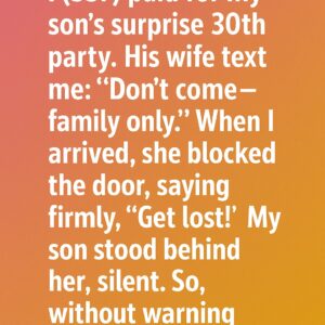 I (55F) paid for my son’s surprise 30th birthday party. His wife texted me, “Don’t come — family only.” When I arrived, she blocked the door, saying firmly, “Get lost!”…