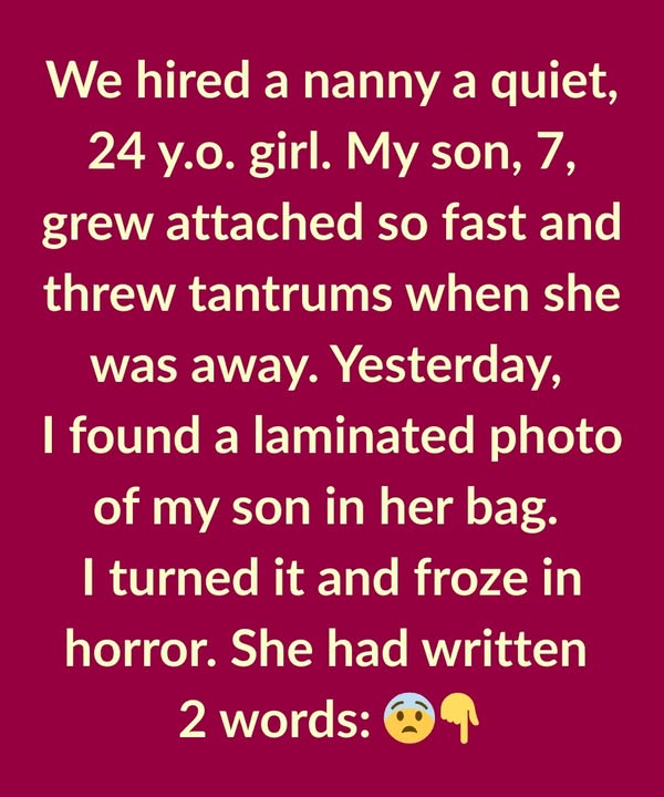 I found a laminated photo of my son in her bag. At first, I thought it was sweet. But then, I turned it and froze in horror. She had written 2 words: “MY son.” I was confused and decided to wait until her next visit to ask what it meant.But that same night,