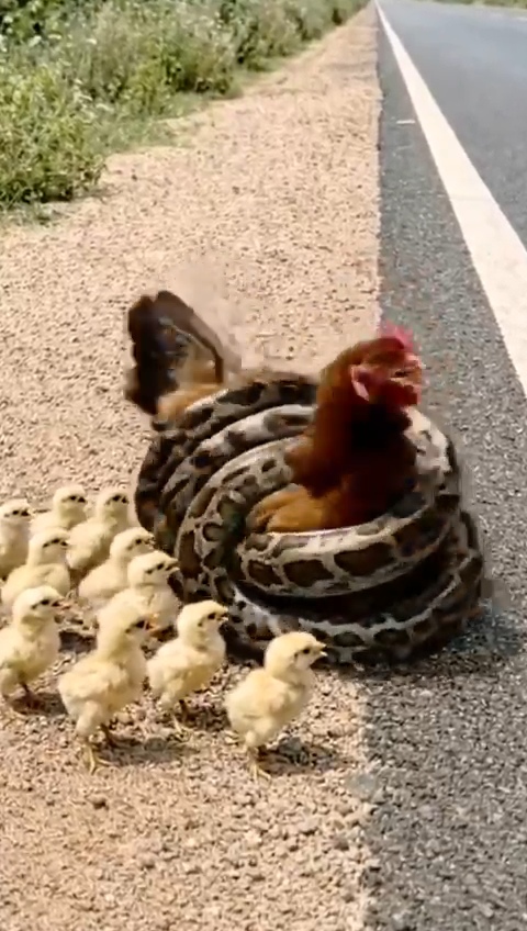 On a quiet roadside, a mother hen stands her ground—surrounded by her tiny chicks and wrapped in an unexpected moment of danger. Whether chance or coincidence, the scene captures pure instinct: protect the little ones, no matter what. Nature has a way of surprising us when we least expect it.WATCH MORE BELOW