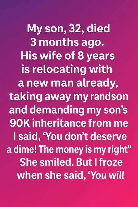 One afternoon, Lily visited and asked for the inheritance Daniel had left behind—ninety thousand dollars. Evelyn felt shock tighten her chest; she wasn’t ready to let go of the last thing she felt connected Daniel to her. “You don’t deserve a dime,” she said, acting out of pain rather than peace. Lily’s calm response unsettled her more than anger would have. She simply smiled, as though she knew something Evelyn did not.