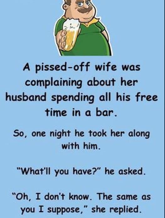 A irate wife complained that her husband spent all of his free time in a pub. So one night, he took her with him. “What’ll you have?” he inquired. “Oh, I do not know. “The same as you, I suppose,” she said. So the husband got a drink and threw it down in one shot.