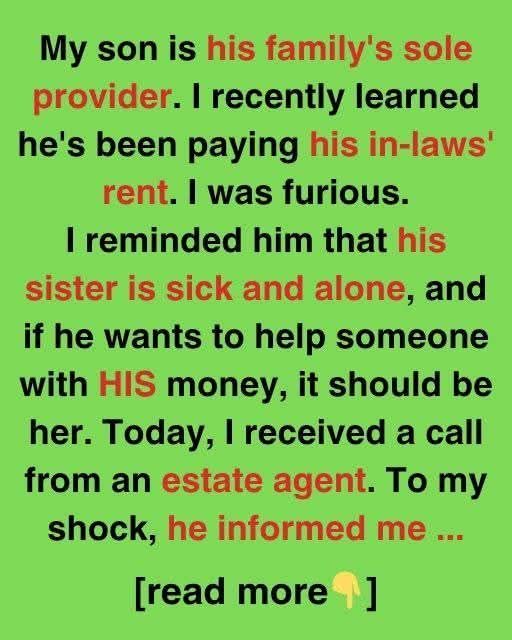 My son supports his family alone. I discovered he pays his in-laws’ rent. I was mad. I told him to aid his sick, lonely sister with his money.