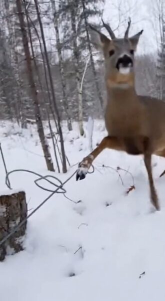 The forest was silent under a blanket of snow when the man noticed the deer struggling. A thin wire had caught around its leg, every movement tightening the trap. Slowly, carefully, the man knelt in the cold…WATCH BELOW