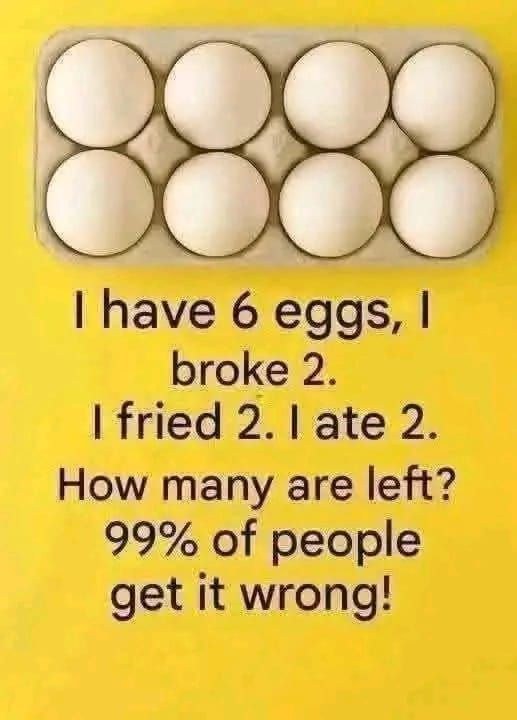 “I have six eggs. I broke two. I fried two. I ate two. How many eggs are left?”