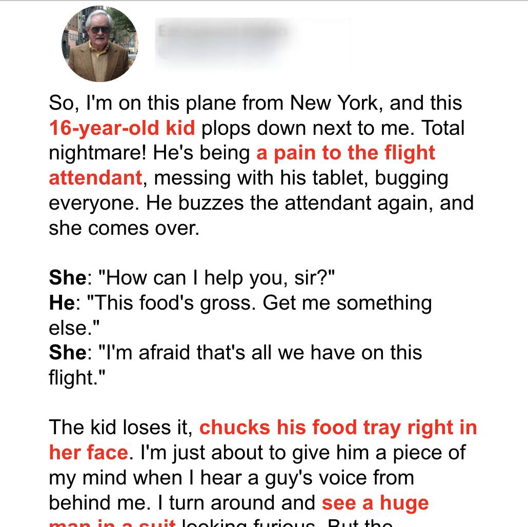 to retrieve his tablet but left his bag protruding from the overhead bin…The flight attendant who’d been assisting the older man earlier approached him. “Your bag is popping out. You didn’t close the overhead bin properly, sir.” “Then do it instead of just standing there. It’s not my job,” Andrew retorted rudely.Despite the lad’s rude words, the stewardess, maintaining her composure, closed the bin and walked away. Andrew, still in a foul mood, began eating some peanuts but spat them out in disgust. He rudely summoned the attendant. “These peanuts taste awful! Get me something