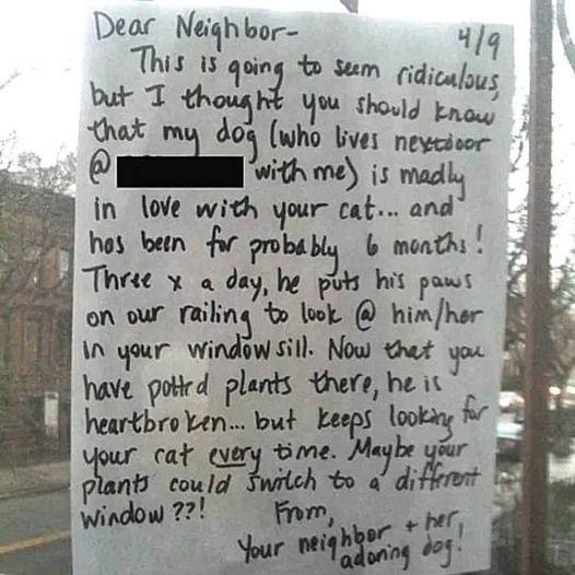 The dog, feeling sad because it couldn’t see the cat, conveyed its distress to its owner. Understanding the situation, she wrote a heartfelt note and attached it to the neighbor’s window: