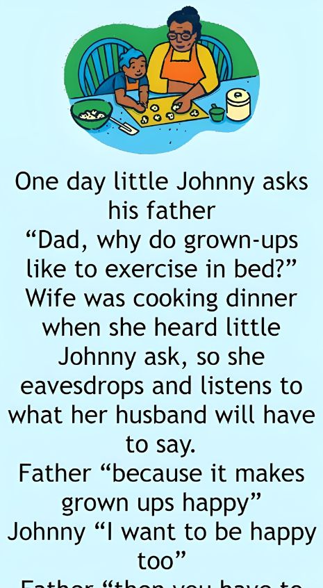 One day little Johnny asks his father “Dad, why do grown-ups like to exercise in bed?” Wife was cooking dinner when she heard little Johnny ask, so she eavesdrops and listens to what her husband will have to say.