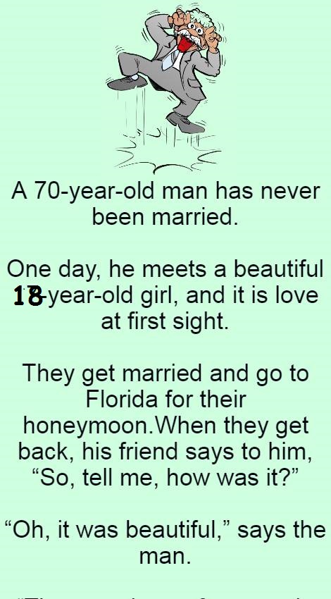 They get married and go to Florida for their honeymoon When they get back, tel frie, howvas him, “Oh, it was beautiful,” says the man. “