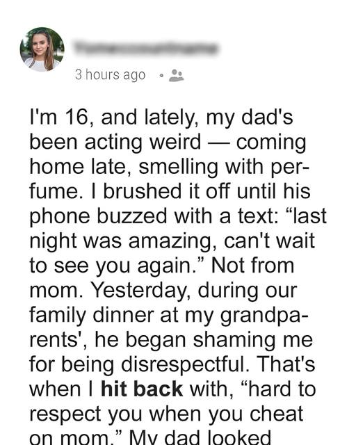 A 16-year-old took to Reddit to find out if they were at fault for exposing their father’s infidelity in front of their family. Before jumping to the main story, the teenager described their relationship with their father.