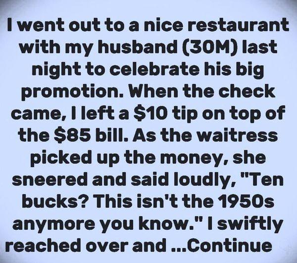 Amelia recently shared her frustrating restaurant experience, raising important questions about tipping etiquette and the quality of customer service today. What was supposed to be a celebratory dinner for her husband’s promotion turned sour due to an encounter with a rude waitress.After enjoying their meal, Amelia left a $10 tip on an $85 bill. However, the waitress responded with a sneer, saying, “Ten bucks? This isn’t the 1950s anymore.”