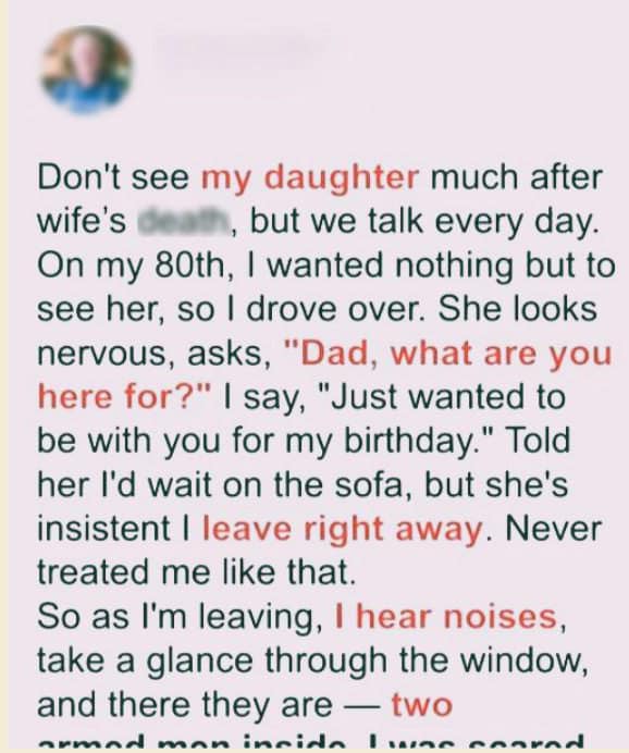 After my wife died, I didn’t see my daughter very often, but we talked every day. On my 80th birthday, all I wanted to do was see her, so I drove over to her apartment, expecting to surprise her. When she opened the door, she appeared apprehensive and surprised. “Dad, what are you here for?” She inquired, her voice weak. I smiled and added, “I just wanted to be with you on my birthday.” Her countenance shifted, and she paused before saying, “Dad, you cannot remain. I have a lot going on.