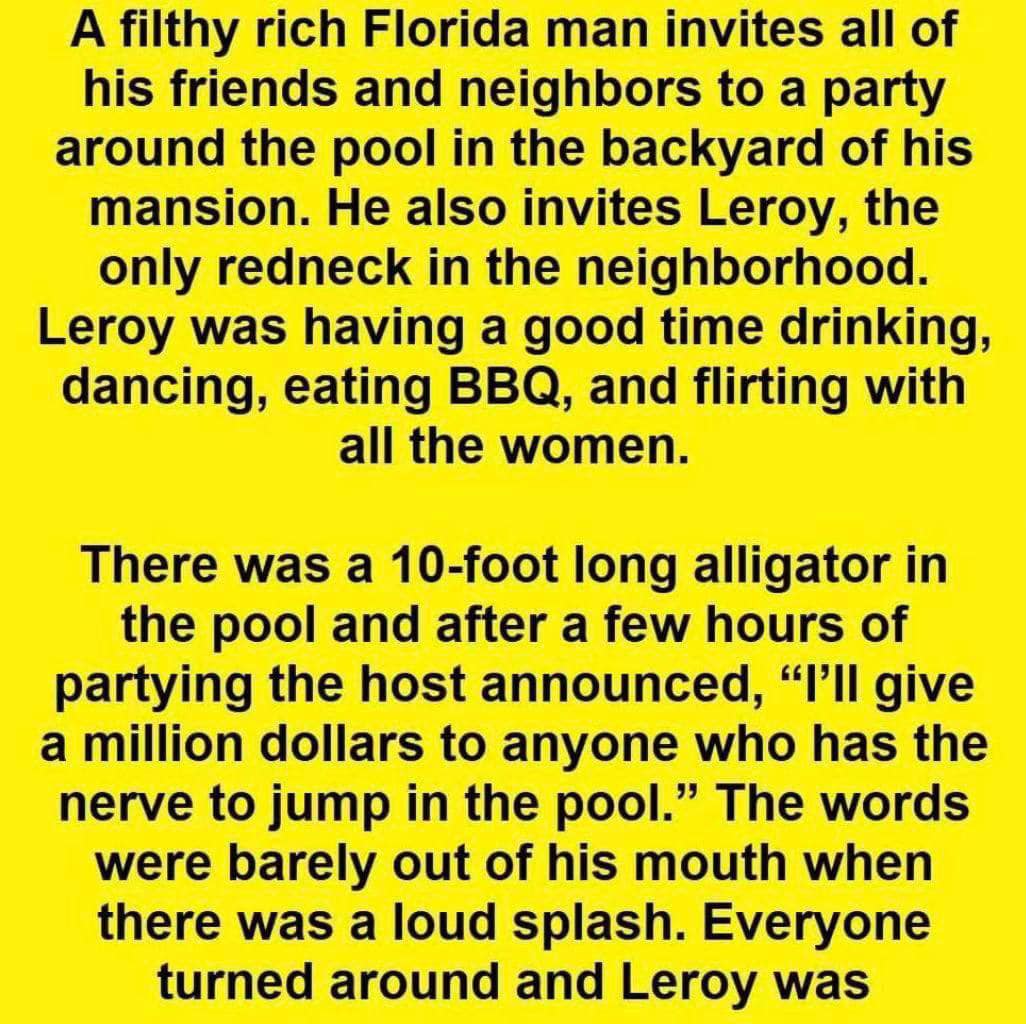 The following joke about a redneck man going to a party with his wealthy neighbors illustrates this point.A filthy rich Florida man invites all of his friends and neighbors to a pool party in his mansion’s backyard. He also welcomes Leroy, the neighborhood’s sole redneck. Leroy had fun drinking, dancing, eating BBQ, and flirting with all the women. After a few hours of partying, the host said, “I’ll give a million dollars to anyone who has the nerve to jump into the pool.” The words had only left his mouth when there was a massive splash. Everyone turned around and discovered Leroy in the pool! The water was swirling and splashing as Leroy fought the gator. Leroy poked it in the eye, punched it, and tried to strangle it. He ultimately succeeded, leaving it floating in the water as he carefully climbed out. The watchers glanced at him with amazement. Finally, the host says, “Well, Leroy, I guess I owe you a million dollars.”“No, that’s OK. “I don’t want it,” Leroy replies.“I have to give you something; you won the bet,” the rich guy continues. “How about a million dollars?” “No thanks,” Leroy says. “I don’t want it.” “I insist on giving you something,” the host declares. Do you want a new Porsche, a Rolex, and some stock options? Leroy declines once more. “Well, Leroy, then what do you want?” The man inquires, confused. “I am seeking the name of the sumbitch who pushed me into the pool.” Leroy concurs.
