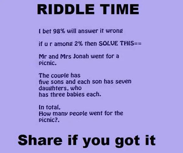 The riddle asks how many people went for the picnic, but only Mr. and Mrs. Jonah are mentioned as going. The rest of the information about their sons, daughters, and grandchildren is just extra detail meant to distract.