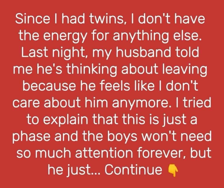 She continued, “Since the twins were born, my whole life has been focused on them. I’m always tired, getting just a few hours of sleep each night. Matt helps, but he has to work long hours, so most of the childcare is on me. I know I’ve been distant, and I feel bad about it, but I’m too exhausted to do anything else. I haven’t had a moment to myself in months, and our relationship has suffered.“Last night, Matt told me he’s thinking about leaving. He said he feels ignored, like I don’t care about him anymore. He said he misses the way things used to be, just the two of us, and now he feels like he’s not important to me. Hearing him say that broke my heart because the truth is, I miss us too. But I don’t know how to be a good mom and a good wife when I’m barely managing to get through the day.”