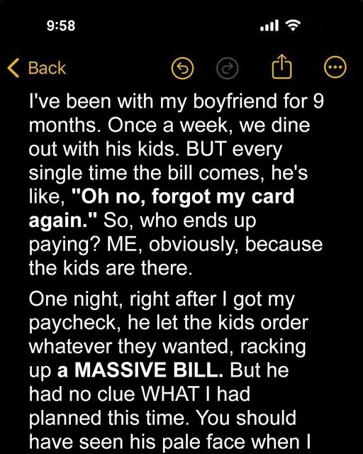 One night, the woman had just received payment from her second part-time job, and she and her boyfriend were going to dinner with his children again. Knowing that he often “forgot” his wallet, she sent him a text reminding him to bring it. Her boyfriend laughed the text off. When they arrived at the restaurant, her boyfriend’s children ordered many new things off the menu, which the woman said were relatively pricey. Before they dove into their meals, the woman asked her boyfriend about his wallet to ensure he had remembered to bring it this time around.