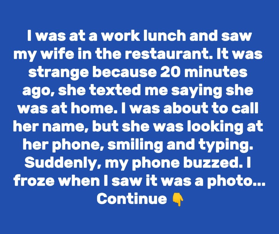I was at a work lunch and saw my wife at the restaurant. It was strange because 20 minutes earlier, she had texted me saying she was at home. I was about to call her name, but she was looking at her phone, smiling and typing, so I just watched her quietly. Then, suddenly, my phone buzzed.